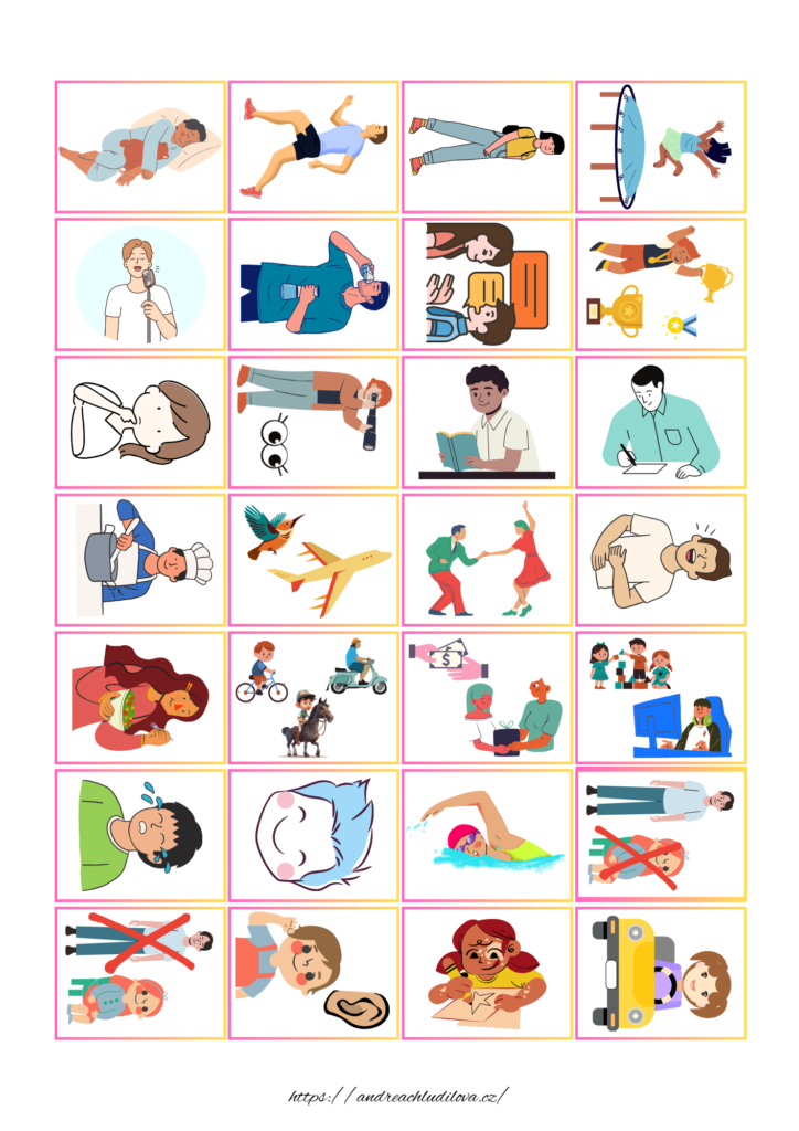 Možná máte stejně jako spousta učitelů i rodičů problém zorientovat se ve spoustě anglických učebnic, cvičebnic a dalších materiálů a najít přesně ten, který vám i vašim dětem vyhovuje. Nedivím se. Angličtinami je trh zahlcen. Tento Pdf soubor není učebnice. Je to podpůrná pomůcka k výuce a upevnění anglických sloves u malých i velkých. Nejen děti totiž potřebují zrakovou oporu, ale také spousta dospělých. Zrakovou oporu zde představují obrázky a texty, hry a pracovní listy. Obrázky i psaná slovíčka jsou uspořádány do kartiček s barvami podle obtížnosti. Celkově je jich 18 stran. Zbytek pak tvoří hry, vkládačky a další pracovní listy, u nichž se kartičky používají. Můžete tedy vkládat, přiřazovat, hrát pexeso, pexetrio, trénovat použití různých časů a spoustu dalšího.