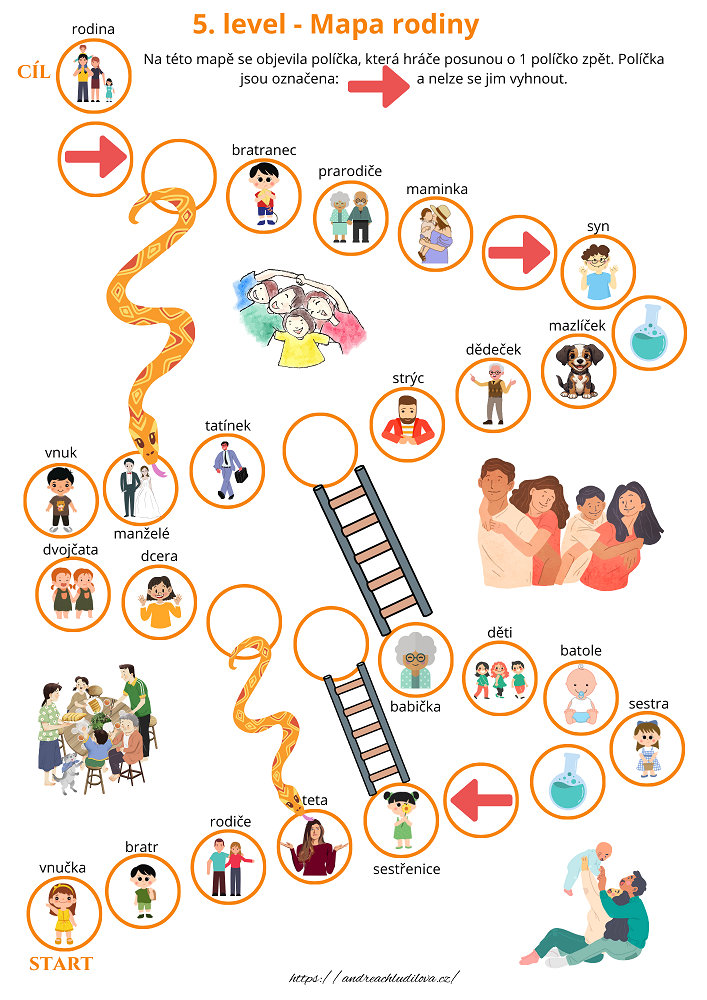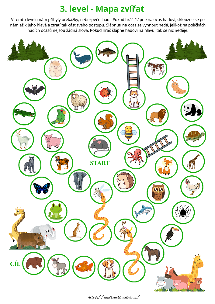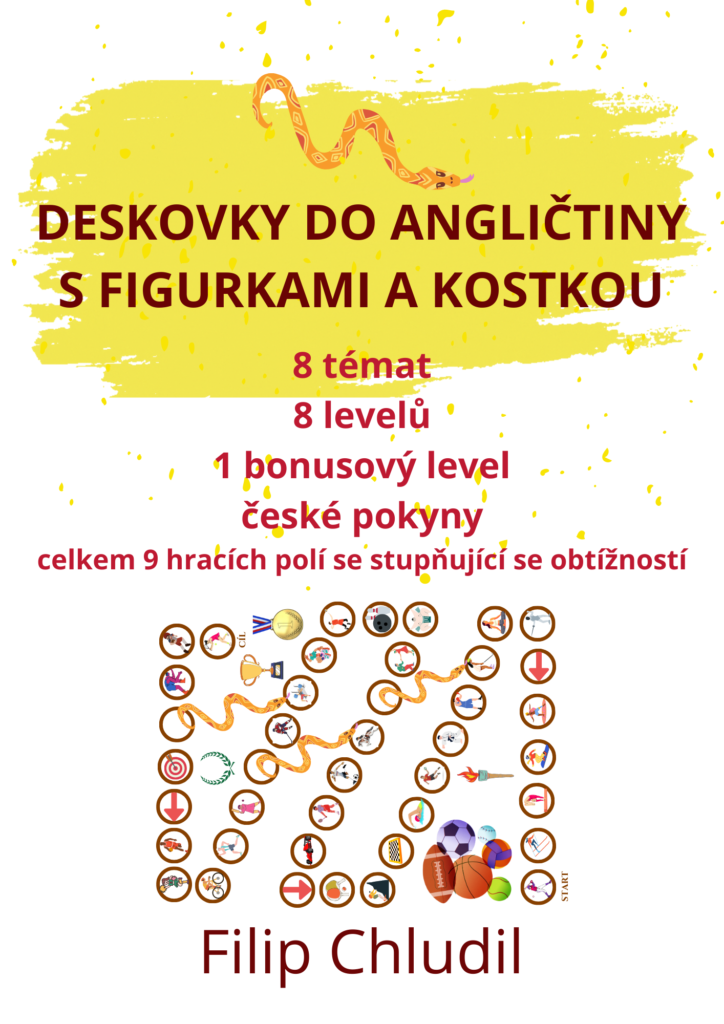 K vaší zábavné výuce jsme připravili soubor deskových her obsahující 8 tématických okruhů. Těmito okruhy projdete postupně 8 levelů, devátý level je pak bonusový. Procvičíte si s dětmi slovní zásobu, zažijete napětí, dobrodružství, pokroky i zklamání, šlápnete na hada či spadnete do černé díry. Postupovat ale může pouze ten, který pojmenuje správně anglicky obrázek, na který šlápne. A to je výzva pro děti, aby si slovíčka zapamatovaly.