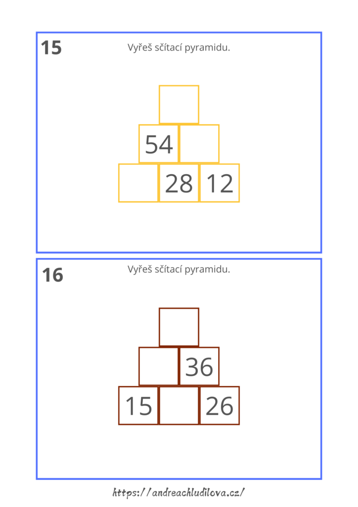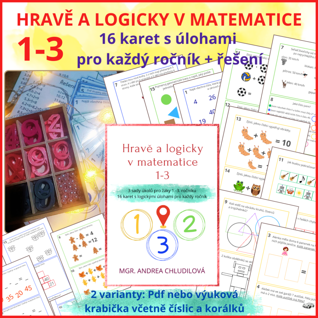 Obsahuje: 16 karet pro každý ročník (1.-3.), krabičku se 4 sadami 3D číslic a s korálky, řešení k okamžité kontrole