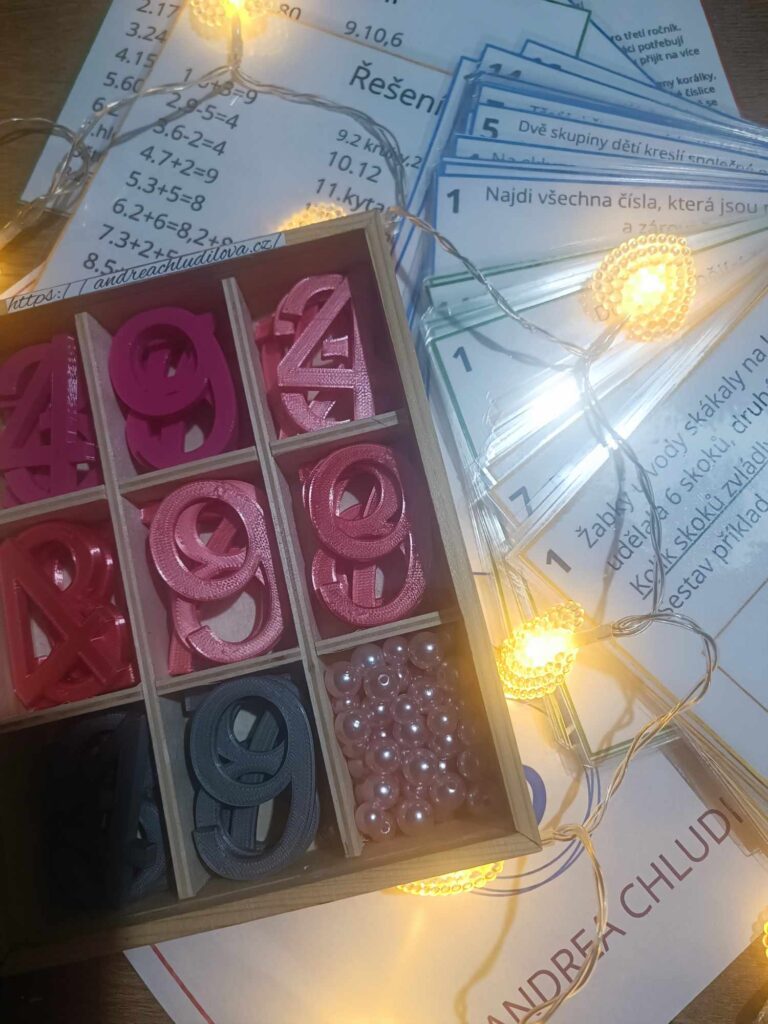Každá autorská krabička obsahuje také pracovní listy, tištěné podklady k příkladům či stolním hrám, 3D číslice nebo dřevěná či jiná písmenka. Vše totiž testuji na svých lekcích přímo s dětmi a tvořím na základě pozorování potřeb jednotlivých skupin žáků. Ať už se jedná o běžné materiály do výuky nebo pro žáky se speciálními potřebami, dbám na to, aby moje pomůcky pomáhaly přesně s tím, k čemu jsou určeny.